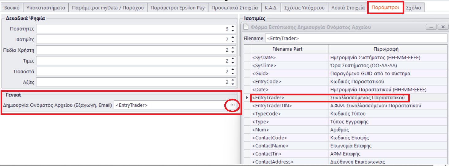 - Επιλέξτε το πλήκτρο Αναζήτησης, στο πεδίο “Δημιουργία Ονόματος Αρχείου Παραστατικού (Εξαγωγή, Email)” και με διπλό κλικ ορίστε την παράμετρο που επιθυμείτε