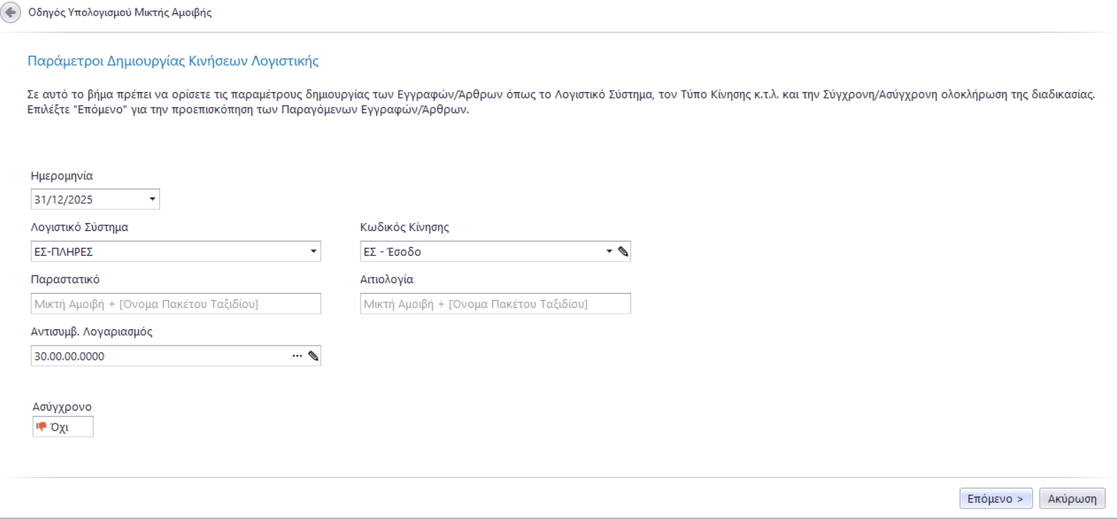 - Για τη δημιουργία της Μικτής Αμοιβής, μεταβείτε στο μενού Κινήσεις-> Εργασίες-> Πακέτα Ταξιδίων-> Μικτή Αμοιβή, προκειμένου να υπολογιστούν τα Έσοδα και τα Έξοδα των πραγματικών παραστατικών (Έσοδα – Έξοδα = Μικτή Αμοιβή), και τρέξτε τον οδηγό. Στο προτελευταίο βήμα ορίστε τον κωδικό κίνησης και τον αντισυμβ. Λογαριασμό( βήμα 2)