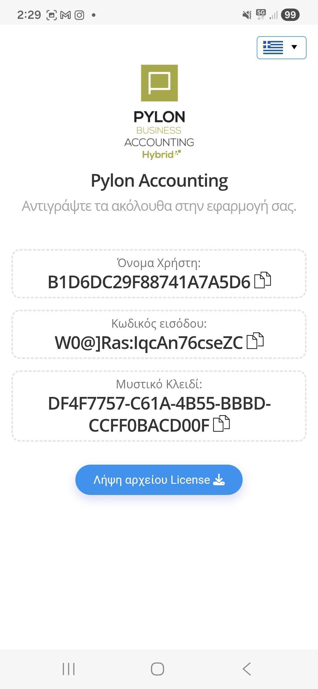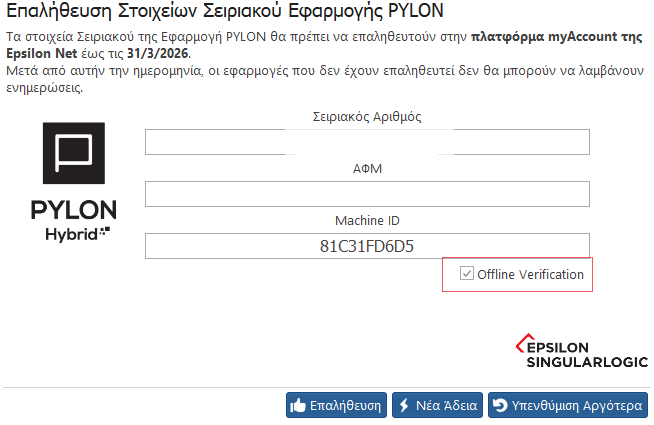 Τα στοιχεία σειριακού της εφαρμογής Pylon θα πρέπει να επαληθευτούν στην πλατφόρμα myAccount της Epsilon Net έως τις 31/03/2026.