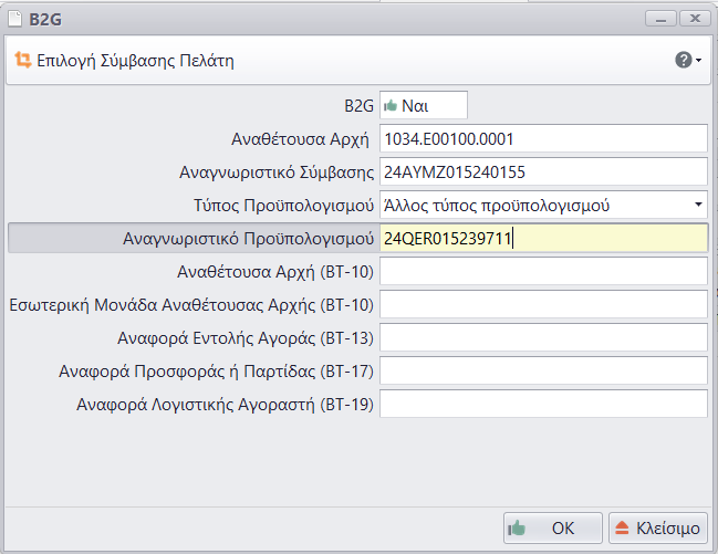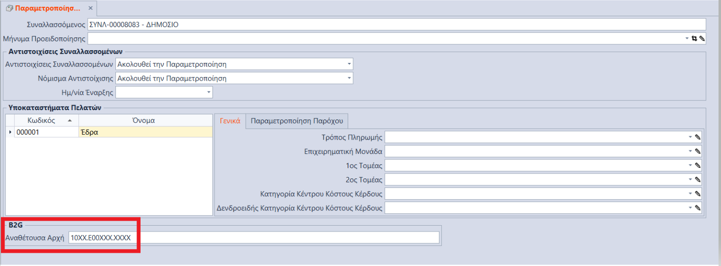 Στους πελάτες που είναι φορείς του Δημοσίου και θα διαβιβασθούν Παραστατικά μέσω Παρόχου Ηλεκτρονικής Τιμολόγησης B2G, θα πρέπει στο πεδίο “Αναθέτουσα Αρχή” να συμπληρωθεί ο αντίστοιχος κωδικός. Μπορείτε να βρείτε τον συγκεκριμένο κωδικό στο Μητρώο Αναθετουσών Αρχών στον παρακάτω σύνδεσμο.