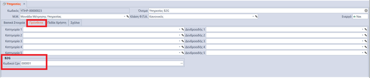 Οι Υπηρεσίες που συμμετέχουν στις κινήσεις B2G θα πρέπει να είναι ενημερωμένες με τον αντίστοιχο “Κωδικό CPV”. Το συγκεκριμένο πεδίο βρίσκεται στο tab: Πρόσθετα της Υπηρεσίας.