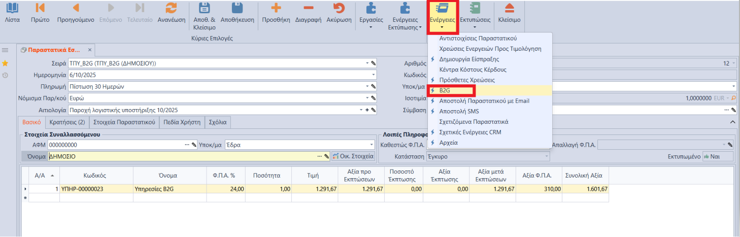 Εφόσον ο Συναλλασσόμενος έχει συμπληρωμένη Αναθέτουσα Αρχή, στο Παραστατικό επιλέγετε από το πλήκτρο: Ενέργειες → B2G.