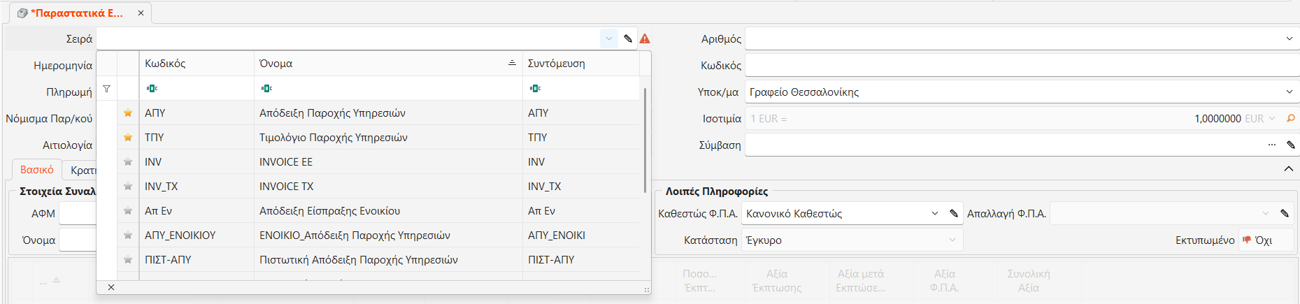 Για την καταχώρηση Παραστατικού Εσόδου θα μεταβείτε στο μενού: Τιμολόγηση → Παραστατικά Εσόδων και θα επιλέξετε το πλήκτρο . Στο πεδίο “Σειρά” επιλέγετε την σειρά που επιθυμείτε από την λίστα. Στο σημείο αυτό, έχετε την δυνατότητα δίπλα από κάθε Σειρά να ενεργοποιήσετε το σήμα με το αστεράκι (προσθήκη αγαπημένου). Εφόσον επιλέξετε το αστεράκι, αλλάζει σε κίτρινο χρώμα. Αυτό σημαίνει, ότι λειτουργεί ως εύκολη πρόσβαση στην αναζήτηση της λίστας. Πχ. εάν στο κύκλωμα των Εσόδων χρησιμοποιείτε πιο συχνά τα παραστατικά ΤΠΥ, ΑΠΥ και έχετε ενεργοποιήσει την προσθήκη αγαπημένων, στην καταχώρηση Παραστατικού θα εμφανίζονται στις πρώτες γραμμές κατά αλφαβητική σειρά.