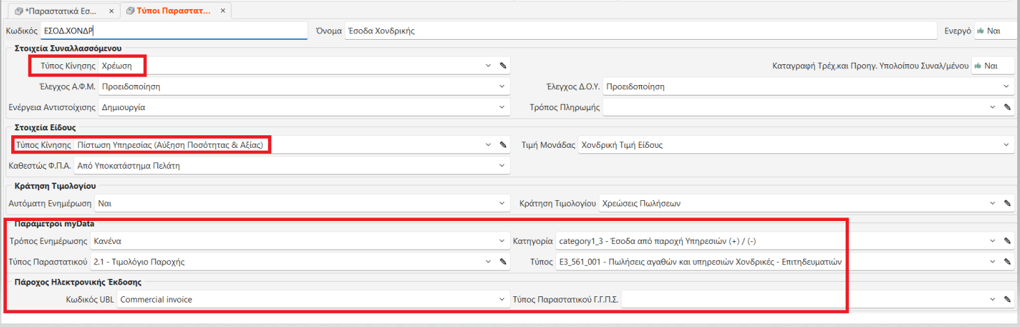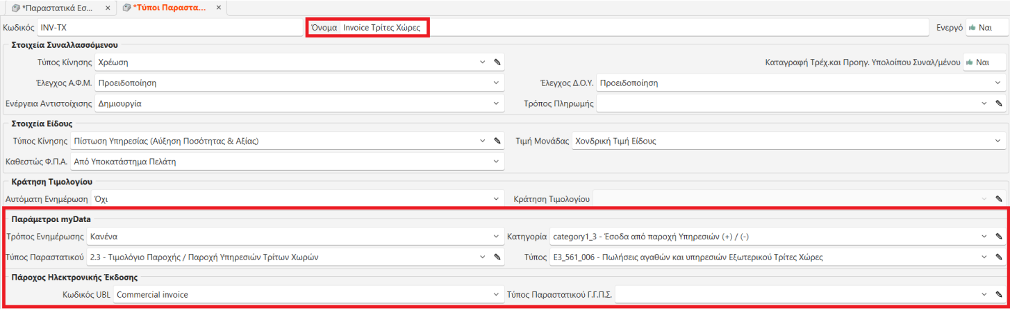 Προσοχή: Σε περίπτωση Ενδοκοινοτικού Παραστατικού ή Τρίτων Χωρών θα πρέπει να δημιουργήσετε ξεχωριστούς Τύπους Παραστατικών και να ορίσετε τις παραμέτρους myData ανά Τύπο.