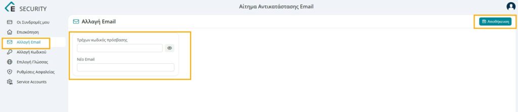 Από το μενού αριστερά επιλέγετε Αλλαγή Email.