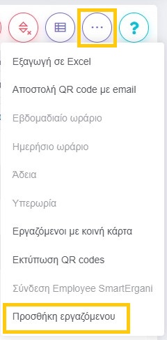 2. Πατάτε επάνω δεξιά το κουμπί Ενέργειες και επιλέγετε Προσθήκη Εργαζομένου.
