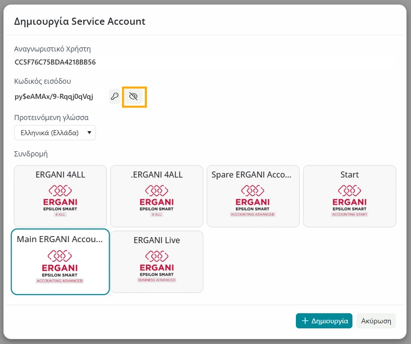 Στο νέο παράθυρο που θα εμφανιστεί, επιλέγετε την Συνδρομή Epsilon Smart Ergani (αν έχετε παραπάνω από μία) για την οποία θέλετε να δημιουργήσετε τον χρήστη API και κρατάτε και τα στοιχεία Αναγνωριστικό Χρήστη και Κωδικός Εισόδου, αντιγράφοντάς τα σε εξωτερικό αρχείο (για να δείτε τον κωδικό πατάτε το κουμπί με το ματάκι στα δεξιά). Τέλος επιλέγετε Δημιουργία.