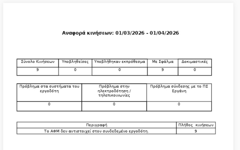 Για να λάβετε αναφορά σχετικά με την κατάσταση υποβολής των κινήσεων κάρτας εργασίας, θα χρειαστεί να μεταβείτε από το πλευρικό μενού αριστερά στις Εκτυπώσεις – Αναφορά Κινήσεων.