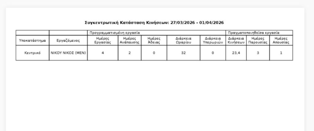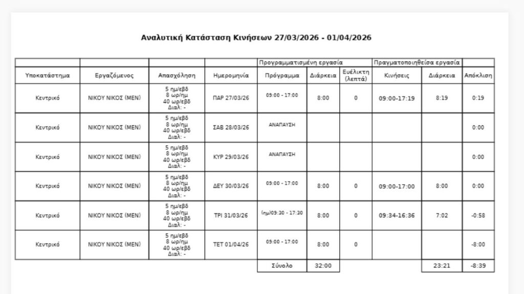 Εμφανίζονται για κάθε ημέρα του επιλεγμένου διαστήματος, οι εργαζόμενοι, στοιχεία της απασχόλησης όπως ημέρες εργασίας ανά εβδομάδα, ώρες εργασίας ανά εβδομάδα, διάλειμμα κ.α. , το ωράριό τους, πιθανές άδειες, οι κινήσεις εισόδου εξόδου και η απόκλιση που προκύπτει από τη σύγκριση προγραμματισμένης και πραγματοποιθείσας εργασίας.