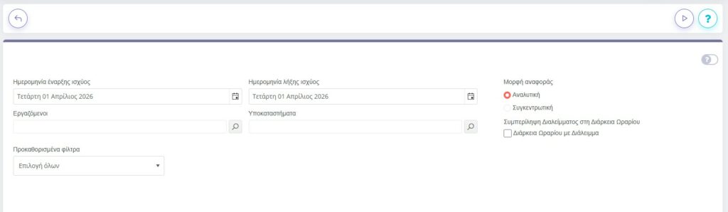 Με χρήση των αντίστοιχων κριτηρίων, μπορείτε να επιλέξετε συγκεκριμένο διάστημα, εργαζόμενους αλλά και εάν θέλετε Αναλυτική ή Συγκεντρωτική εκτύπωση.