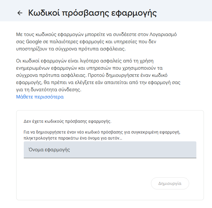 - Μεταβείτε στο παρακάτω link για να δημιουργήσετε προσωρινό κωδικό για το gmail ώστε να το δηλώσετε στο Taxsystem: https://myaccount.google.com/apppasswords