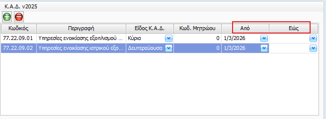 - Η στήλη «Από» (Ημερομηνία Έναρξης) ενημερώνεται μόνο μέσω της Μαζικής Επικαιροποίησης ΚΑΔ.